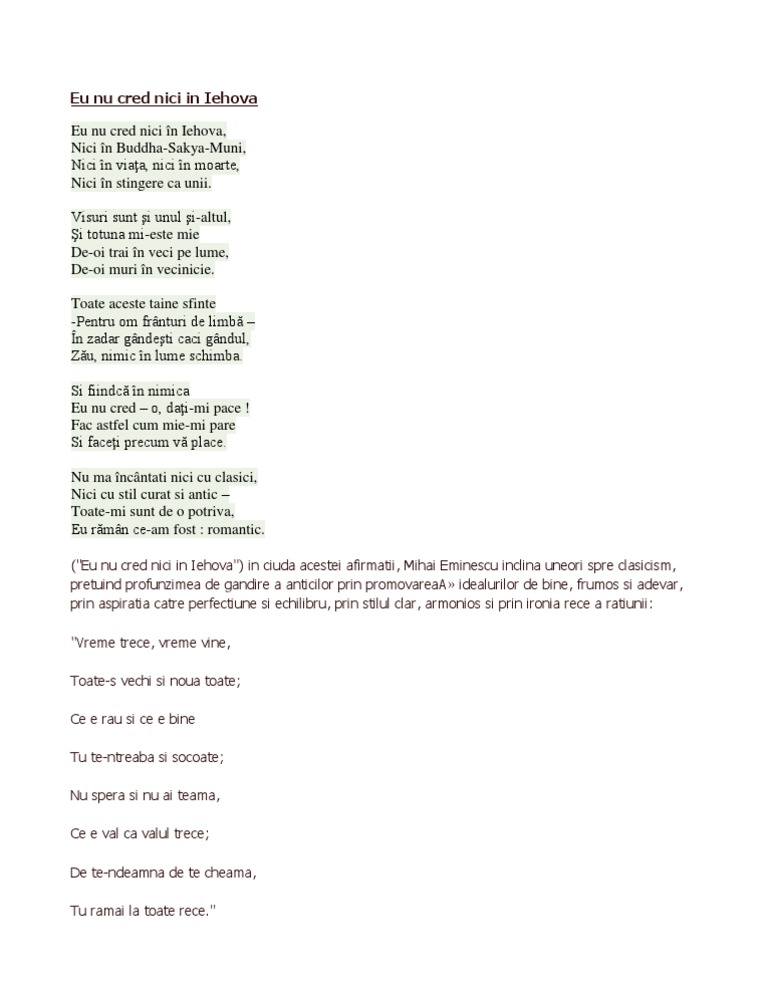 Eu nu cred nici in iehova de mihai eminescu. Versuri >> m >> mi >> mihai eminescu >> eu nu cred nici în iehova. (eu nu cred nici in iehova) in ciuda acestei afirmatii, mihai eminescu inclina uneori spre clasicism, pretuind profunzimea de gandire a anticilor prin promovareaa idealurilor de bine.
